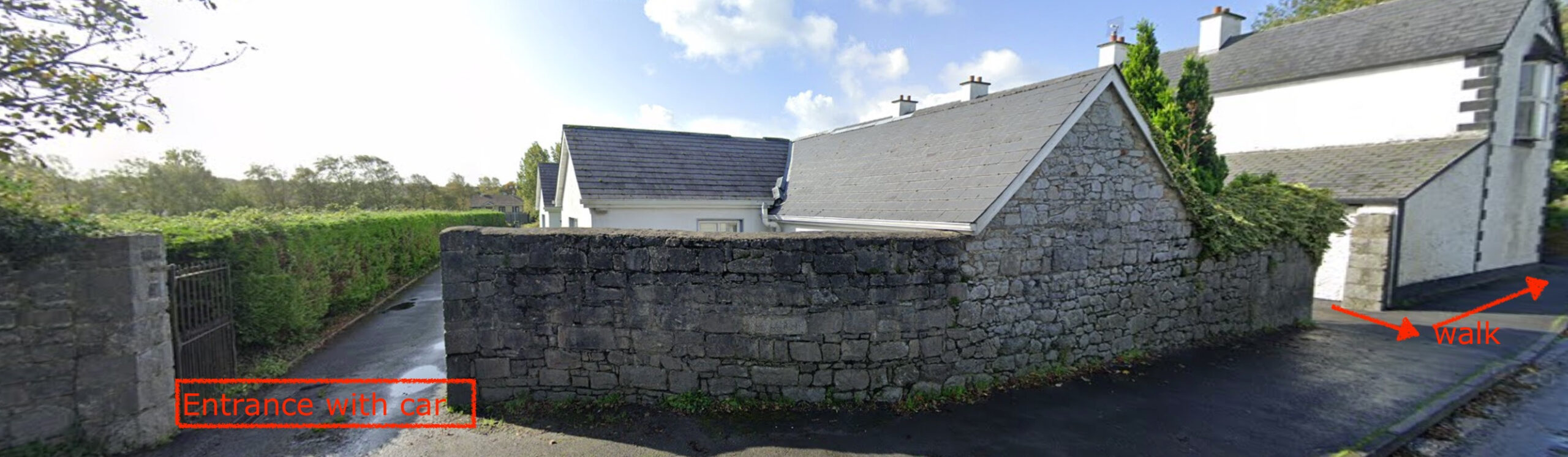 2. If coming from the bypass or the Lahinch Road, once you come off the Claureen Roundabout keep an eye out on the right side for the gable end of a white country style house and take the second little turn on your right between the two stone walls. Be careful for exiting cars. Park there noting the line markings. Walk through the court yard and out onto the Lahinch road footpath again going left. Then you will see a pedestrian gate. Go in there and follow the path under the archway- it goes around to the right to a large building with a brown door.