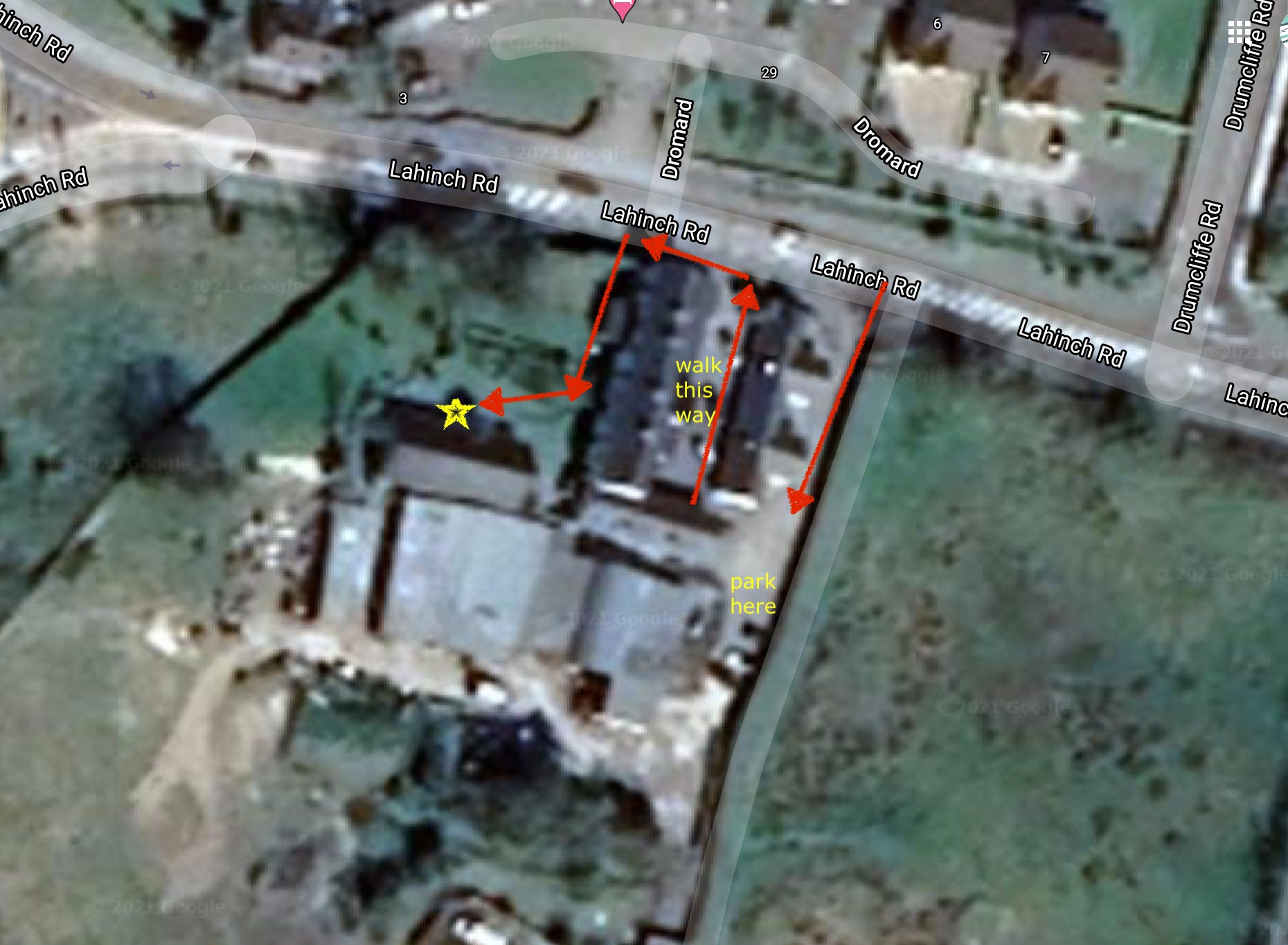 1. If coming from the Maid of Eirn roundabout head out the lahinch road. Pass the left turn for Cloughleigh, pass the left turn to Brookville/Dun na hInse and then you will see the gable end of a white country style house and take the narrow left turn just before that between the two stone walls. Be careful for exiting cars. Park there noting the line markings. Walk through the courtyard and out onto the Lahinch road footpath again going left. Then you will see a pedestrian gate. Go in there and follow the path under the archway- it goes around to the right to a large building with a brown door.